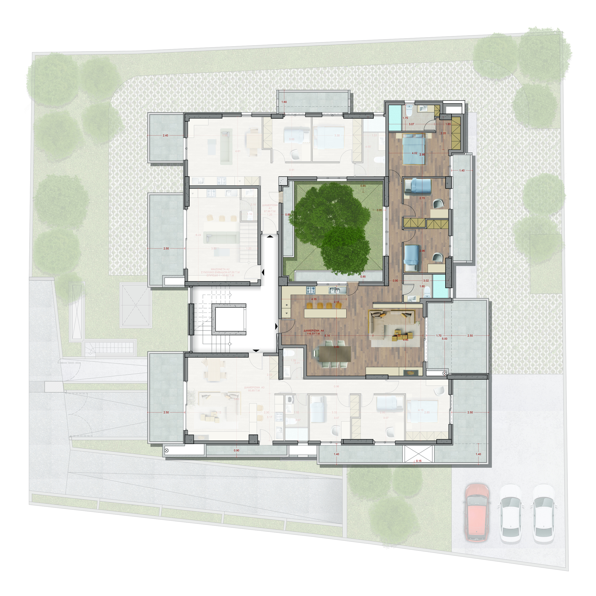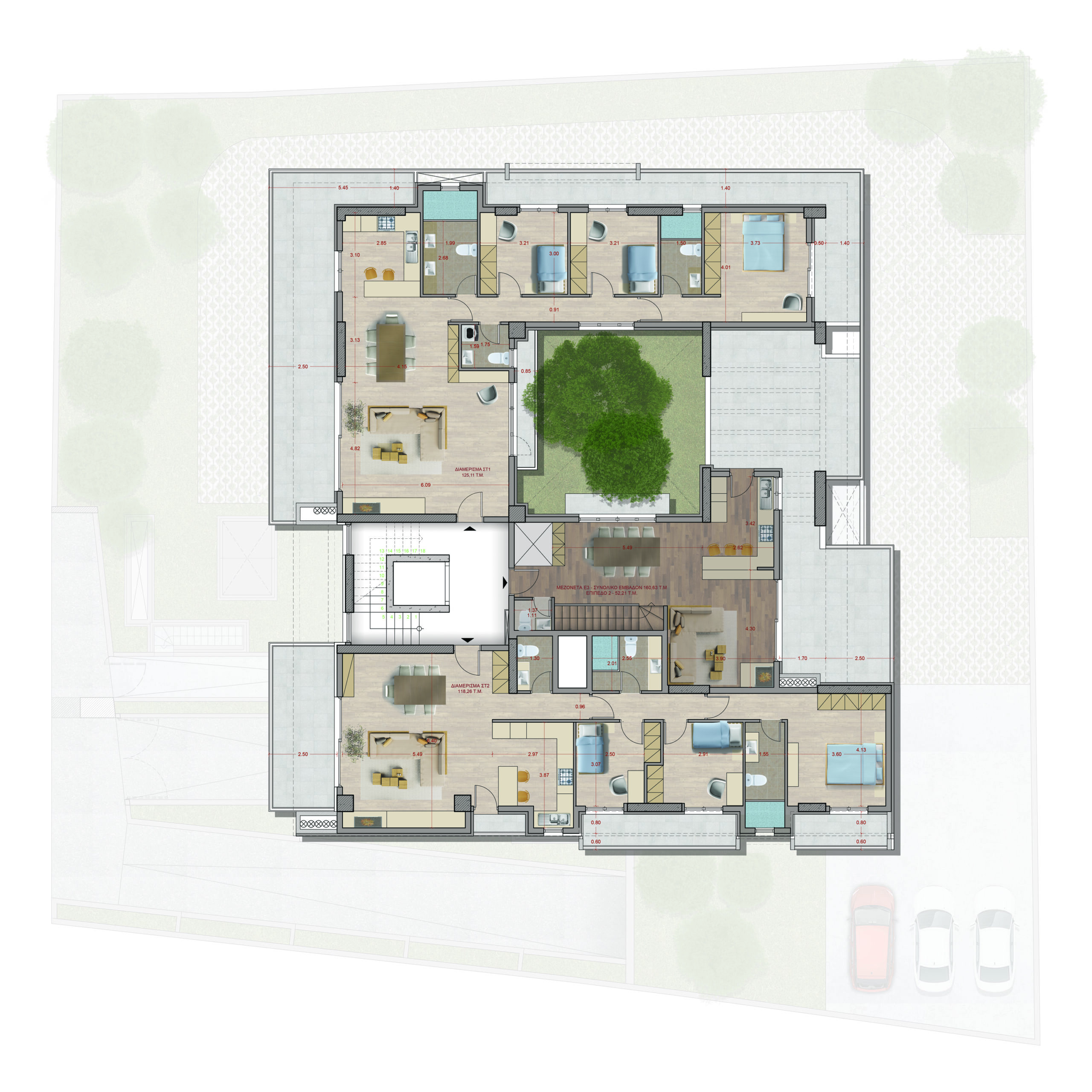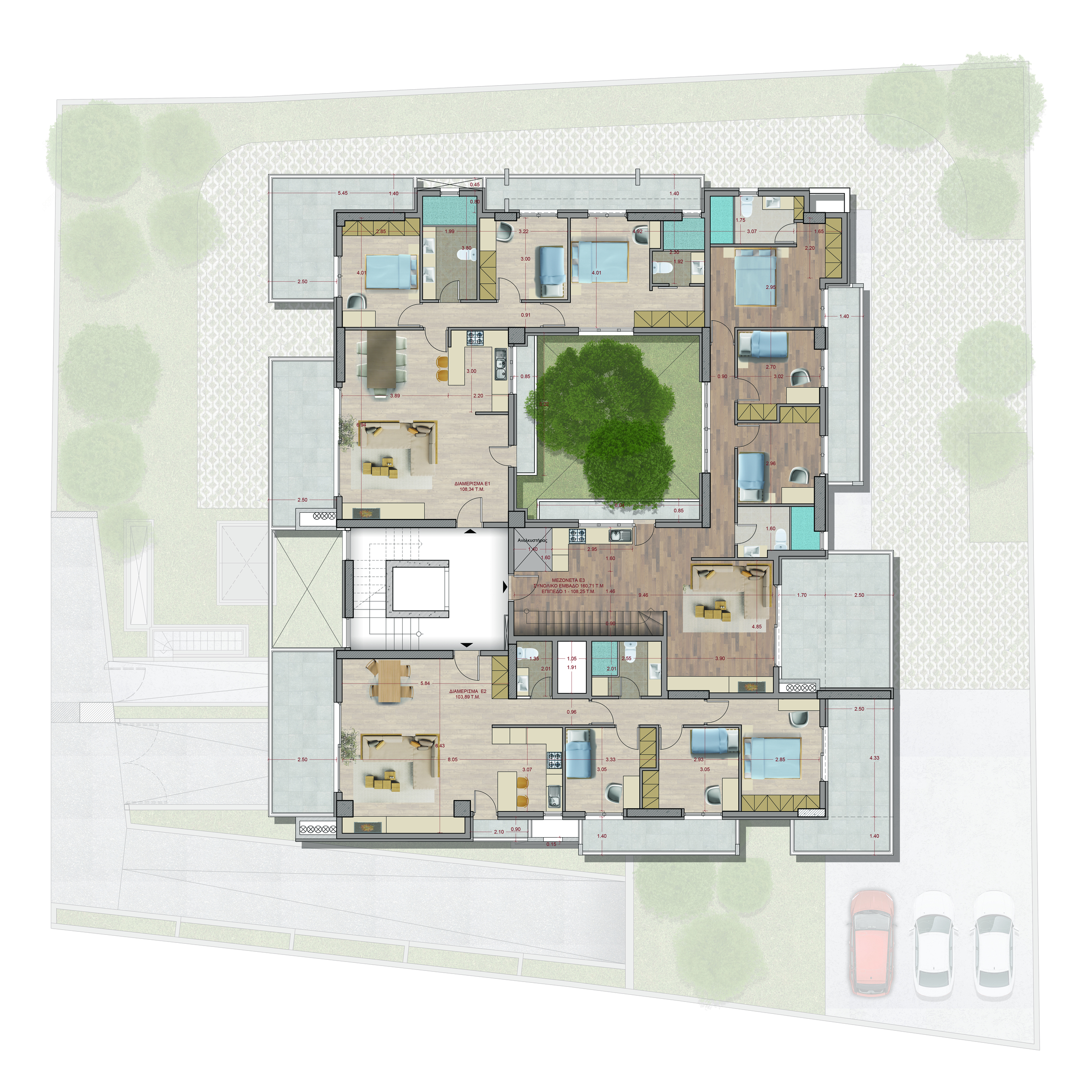 Εσωτερικό αίθριο, διαστάσεων 6.99 Χ 6.94 μ. με φύτευση στο ισόγειο